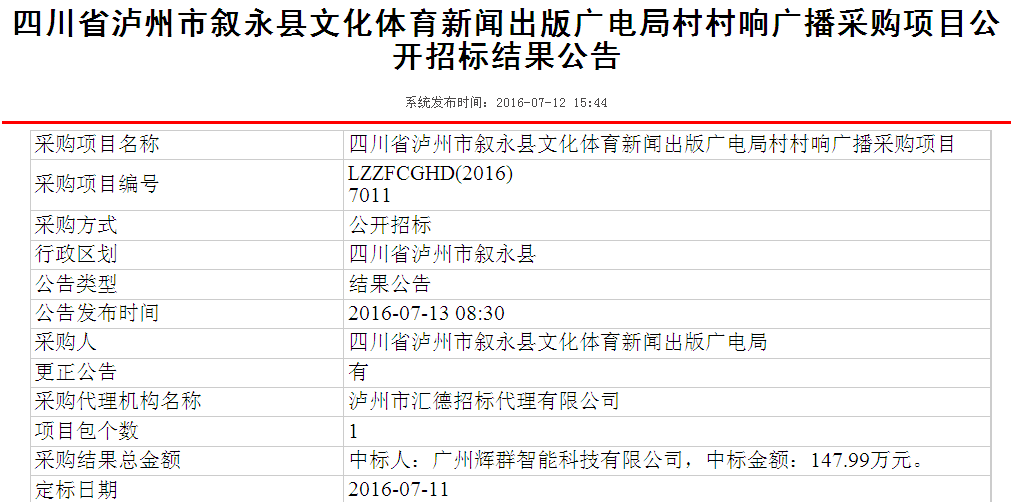 熱烈祝賀廣州輝(huī)群智能科技有限公司在四川省瀘州(zhōu)市敘永縣文化體育新聞出版廣電局發布的“四川省瀘(lú)州市敘永縣文化體育新(xīn)聞出版廣電局村村響廣播采購項目, 采(cǎi)購(gòu)項目編號:LZZFCGHD(2016)7011”項目投標中,順利中標。!